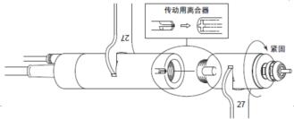 將馬達前部的螺絲對準主軸后部的螺絲朝順時針方向轉(zhuǎn)動。如果旋轉(zhuǎn)傳動用離合器未嚙合時,與馬達連接的螺絲旋轉(zhuǎn)2圈就不能轉(zhuǎn)動,這時,不可用力緊固,將螺絲稍微旋出后用手指轉(zhuǎn)動,使離合器嚙合后再擰螺絲,最后用附帶的27mm扳手緊固。