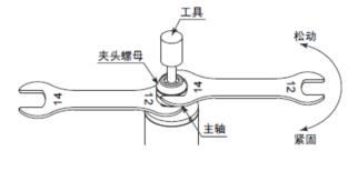 在夾頭螺母上套上附帶的14mm扳手朝逆時針方向轉(zhuǎn)動,夾頭松動后取下工具。(轉(zhuǎn)動約1圈夾頭螺母可緊固1次,再次轉(zhuǎn)動后夾頭被打開。)