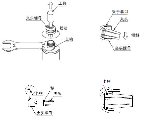 注意:把夾頭裝到夾頭螺母上的時候,請保證使夾頭槽準確地進入螺母卡鉤。否則在擰緊螺母后,有時夾頭會留在主軸內(nèi),無法取出。