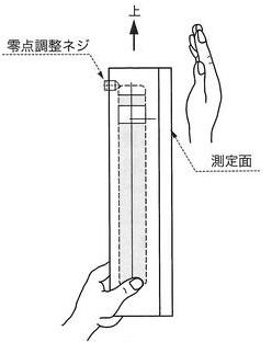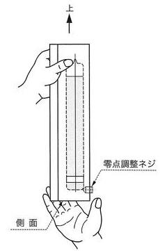 如右圖:零點(diǎn)調(diào)整旋鈕朝上, 用手輕輕拍打水平儀測(cè)量面。 |