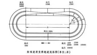比賽在周長400米的跑道上進(jìn)行,跑道由兩條直線和兩條180度的弧線連接而成,分內(nèi)、外兩道,道寬5米。內(nèi)跑道的內(nèi)圈半徑為25米,外跑道的內(nèi)圈半徑為30米。比賽時(shí)每組2人,同時(shí)滑跑,每滑1圈交換1次內(nèi)、外道。