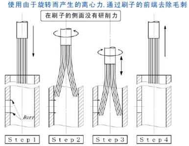 XEBEC銳必克內(nèi)孔去毛刺:可同時(shí)進(jìn)行去毛刺和內(nèi)壁拋光。?務(wù)必保證刷毛部分進(jìn)入孔內(nèi)后,再開(kāi)始旋轉(zhuǎn),否則刷毛可能會(huì)損壞或分散危險(xiǎn)。
