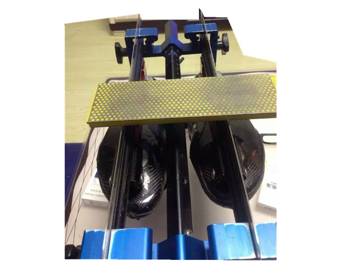 把冰刀倒著固定在架子上,四個螺母松緊要一致。檢查一下兩個冰刀前后端是否對齊,高低、垂直度是否因特殊原因而產(chǎn)生明顯的差距。有的磨刀架帶有冰刃高度固定裝置,可用之。本人的磨刀架因為沒有這個裝置,所以找平的時候,把上好冰刀的架子倒過來,在瓷磚上找平,然后,擰死螺栓,翻過來開始磨。