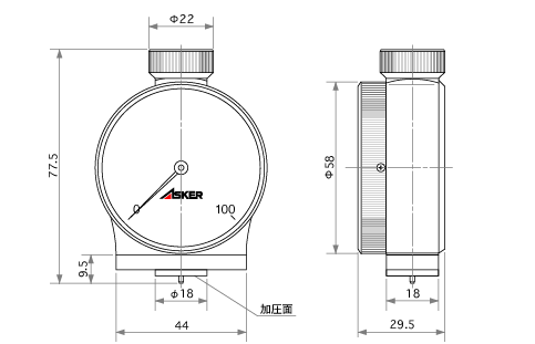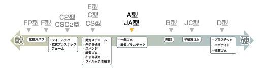 上圖所示為橡膠硬度計的種類圖, 根據(jù)試樣的種類設(shè)計不同的硬度計. 符合 JIS K 6253標(biāo)準(zhǔn)的A型橡膠硬度計是最普遍最常用的一款.但是通常情況下,測量值在10點(diǎn)~90點(diǎn)之間,使用A型硬度計,A90點(diǎn)以上時使用D型硬度計(硬質(zhì)材料使用),A20點(diǎn)以下時使用C型或E型硬度計(軟質(zhì)材料使用)。就是說,根據(jù)試料的種類選擇合適的機(jī)型最重要