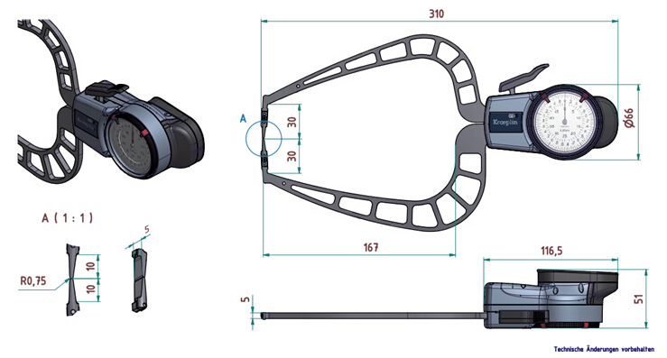 • 德國原裝進口kroeplin帶表外卡規(guī)D450S,測量范圍:0-50mm,精度0.05mm,喉深長度167mm。